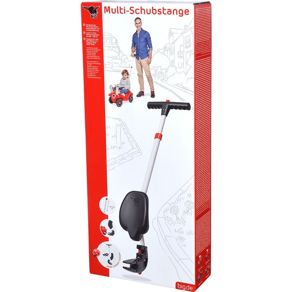 De geïntegreerde rugleuning biedt ook extra ondersteuning voor de kinderen en de nieuwe ergonomische handgreep maakt ook een tweehandige bediening mogelijk. Dit maakt het rijden gemakkelijker voor zowel de kleintjes als de volwassenen. Het eenvoudig te bedienen telescopische frame is in 4 posities in hoogte verstelbaar (van 88 cm – 107,5 cm) en kan in de transportpositie worden gebracht voor ruimtebesparend transport. De montage is zeer eenvoudig met een koppelingspin die al aan de duwstang is bevestigd. De BIG -Multi-Pushrod is geschikt voor alle BIG -Bobby-Car modellen, de BIG -Bobby-Car Class ic, de NEXT , de New en de Neo.