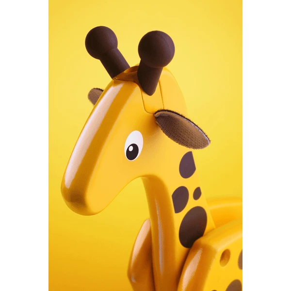 Houten giraf. Zijn hoofd beweegt als hij wordt voortgetrokken. Het spelen met deze giraf helpt bij het leren lopen. Spelenderwijs leer je tenslotte het snelst!