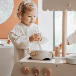 Was alle niet-houten delen van het product grondig af voor het eerste gebruik. Alleen te gebruiken als speelgoed. Gebruik het niet met de juiste voeding of een goede kachel/oven.