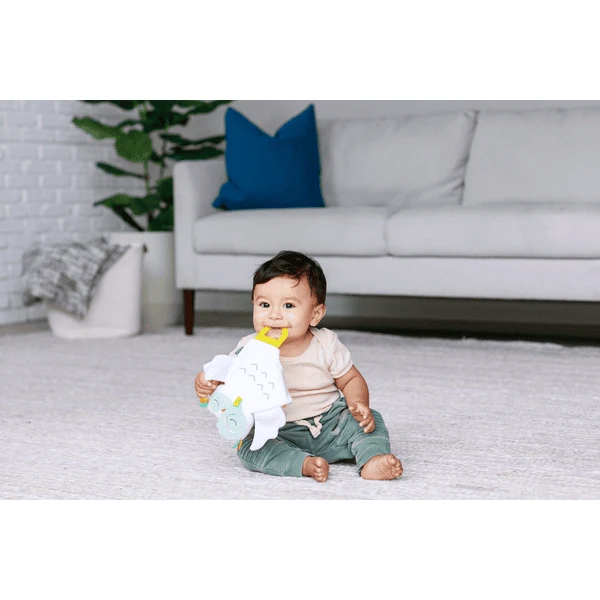 Als het donker is, zal uw baby het heerlijk vinden om tegen Cuddly Pal aan te kruipen, omdat deze met zijn zachte gloed troost en geruststelt. De oplichtende bijtring kan 20 minuten branden met natuurlijk of kunstmatig licht aden . De gloeifunctie wordt automatisch geactiveerd in het donker. De schattige uil is gemaakt van zachte stof en biedt uw kind tegelijkertijd een tactiele ervaring.