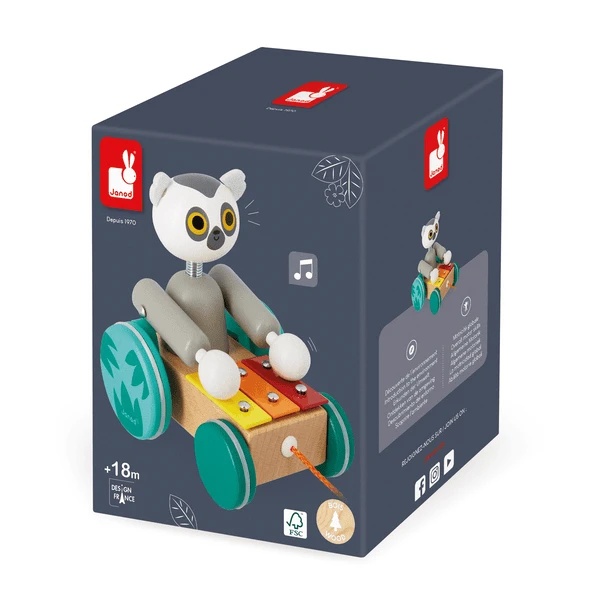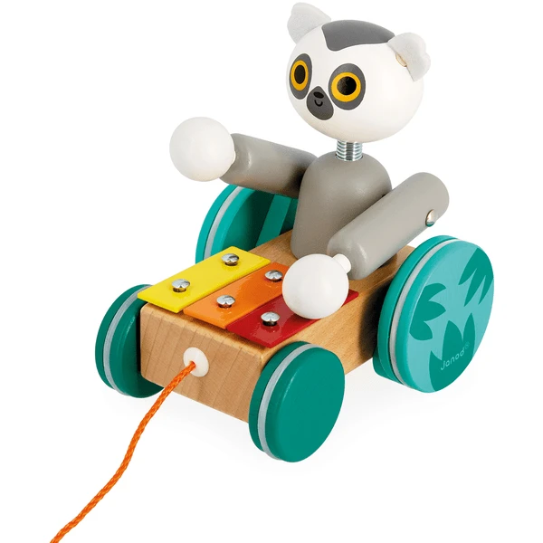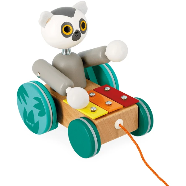 - Als uw kind aan de maki trekt, bewegen zijn armen en slaan ze om beurten op de kleurrijke geluidsbalken van de Xylofon