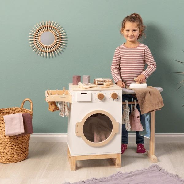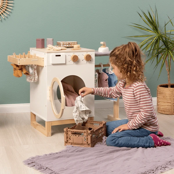 Samen het huishouden doen geeft dubbel zoveel plezier. Het wascentrum past perfect bij de MUSTERKIND ® speelkeukens “Linum” & “Magnolia”.