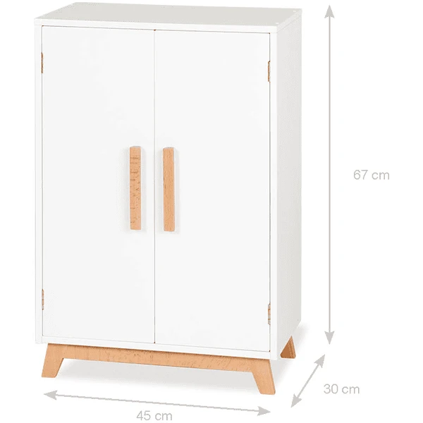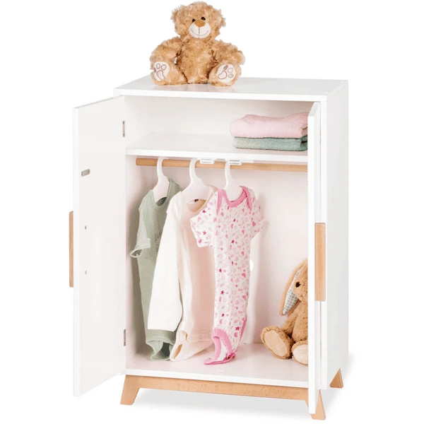 De mooie vorm, gecombineerd met de kleurenmix van beuken en wit doet de ogen van elke poppenouder stralen. Dankzij de legplank en een kledingstang zijn alle kleren binnen handbereik en kunnen ze snel en netjes weer worden opgeborgen.