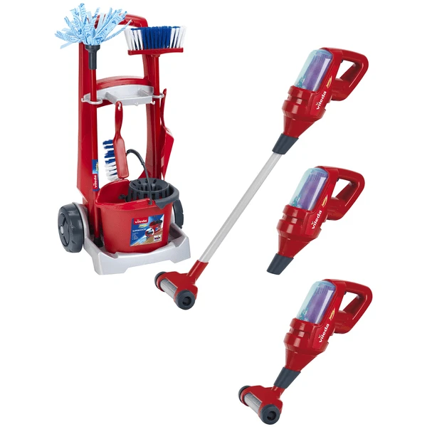 - Inhoud: 1 mop, 1 emmer met opzetstuk, 1 bezem, 1 handborstel, 1 handschep, 1 stofzuiger