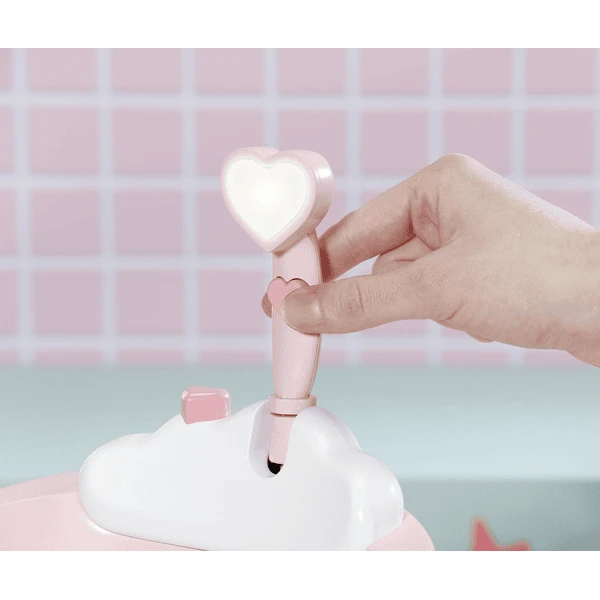 Als je de hartvormige knop op de douchekop even aanraakt, hoor je water wegspatten. Als je hem ingedrukt houdt, licht het hart in de douchekop op en creëer je met de lichtstraal de illusie van een waterstraal. Baby Annabell kan hier dan speels mee overgoten worden.