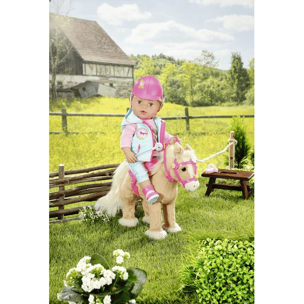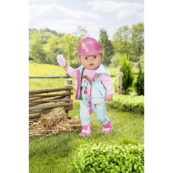 De rijbroek heeft een verstevigd zitvlak. De longsleeve heeft een schattig paardengezichtje erop. De ruches aan de mouwen maken het hemd mooi onder het gilet. Het behaaglijke vest heeft een capuchon, zodat de wind niet zo om je oren waait als je aan het galopperen bent. De roze helm en de roze laarzen zijn bedrukt met speciale elementen.
